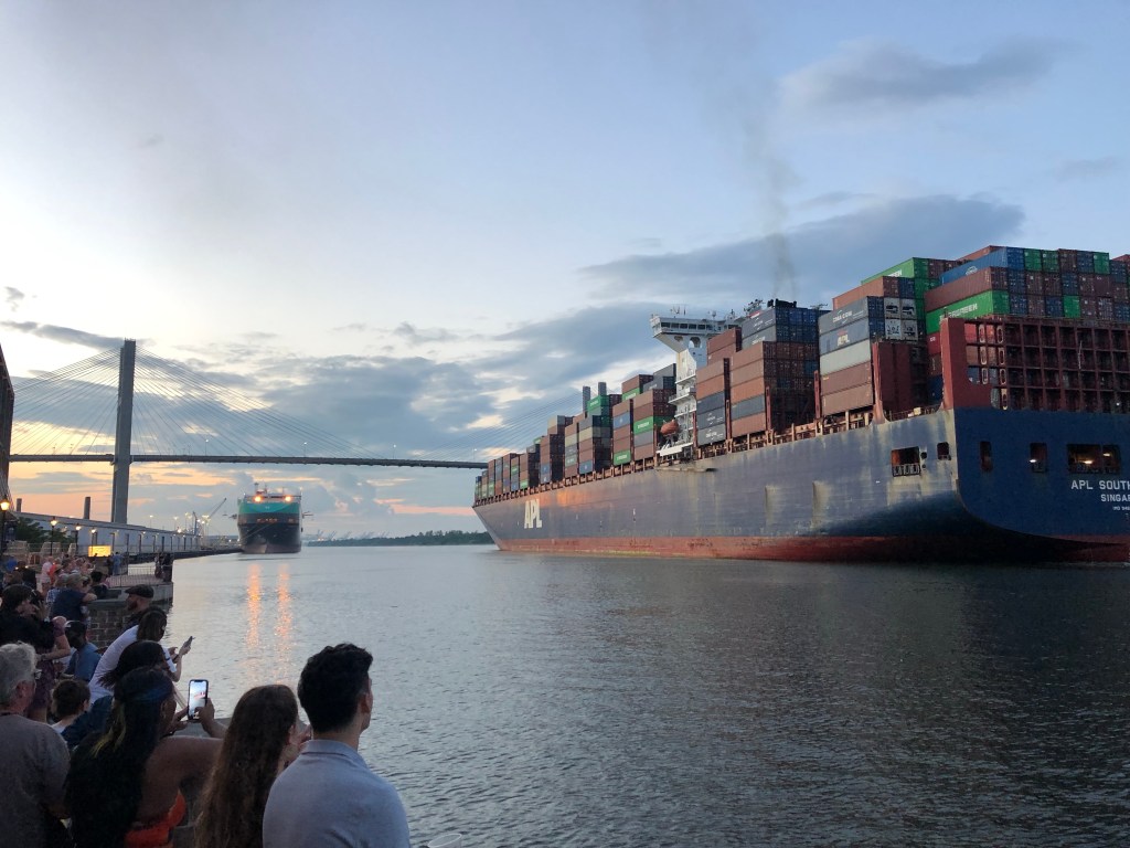 Savannah, Georgia’s seaport is the 3rd busiest in the United States. Massive cargo ships go under the Talmadge Memorial Bridge every few minutes as you enjoy The Plant Riverside District.